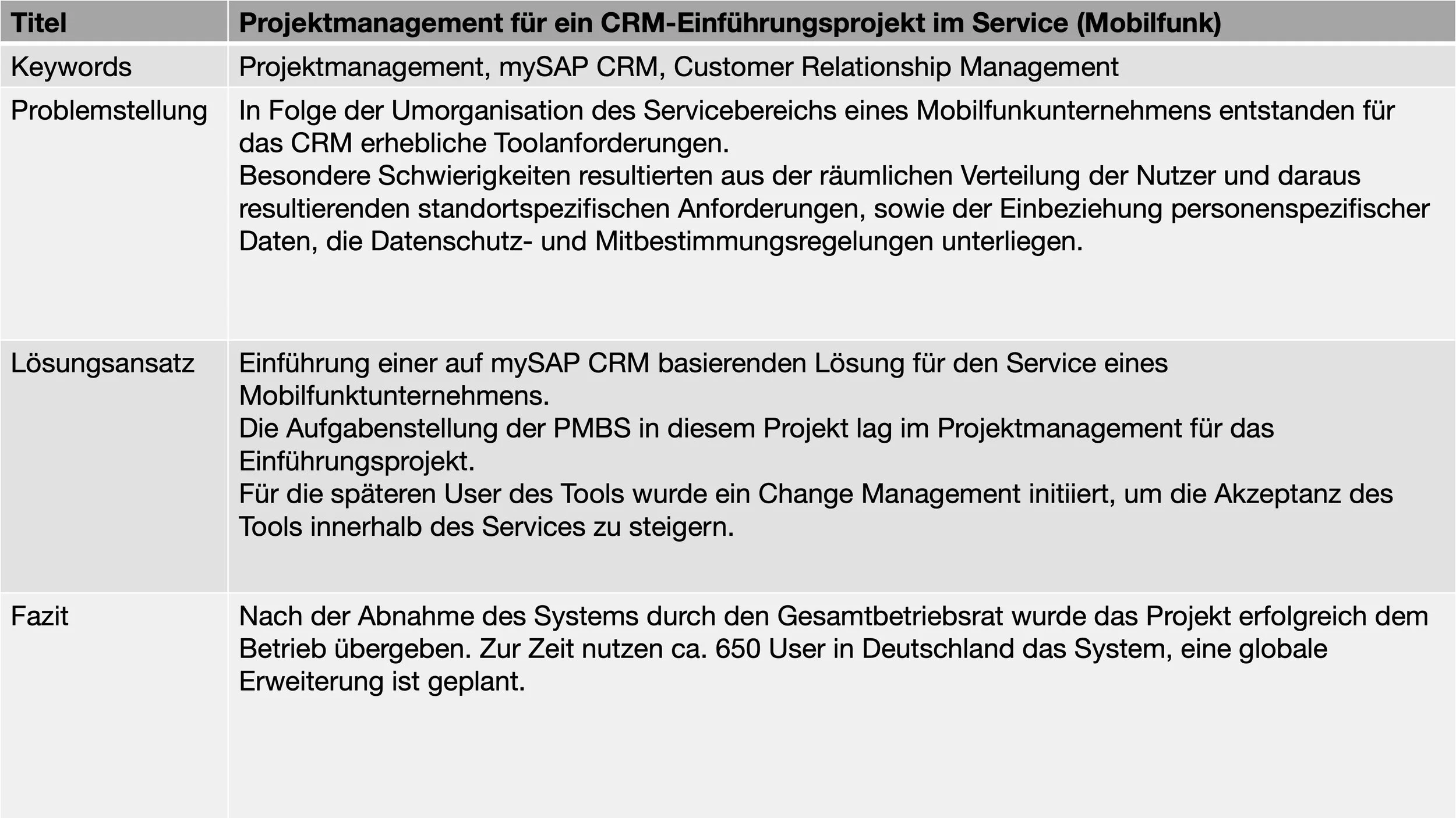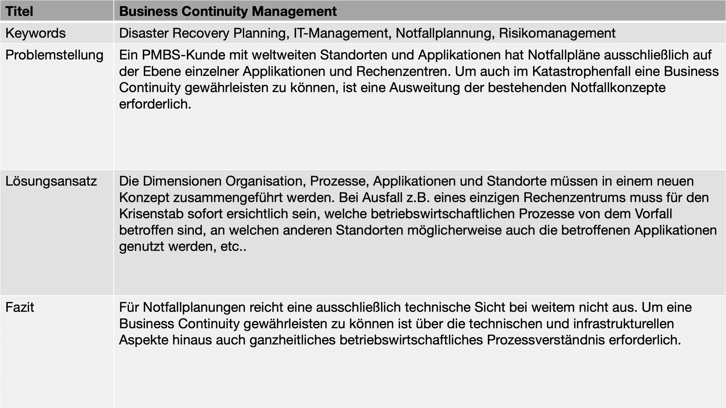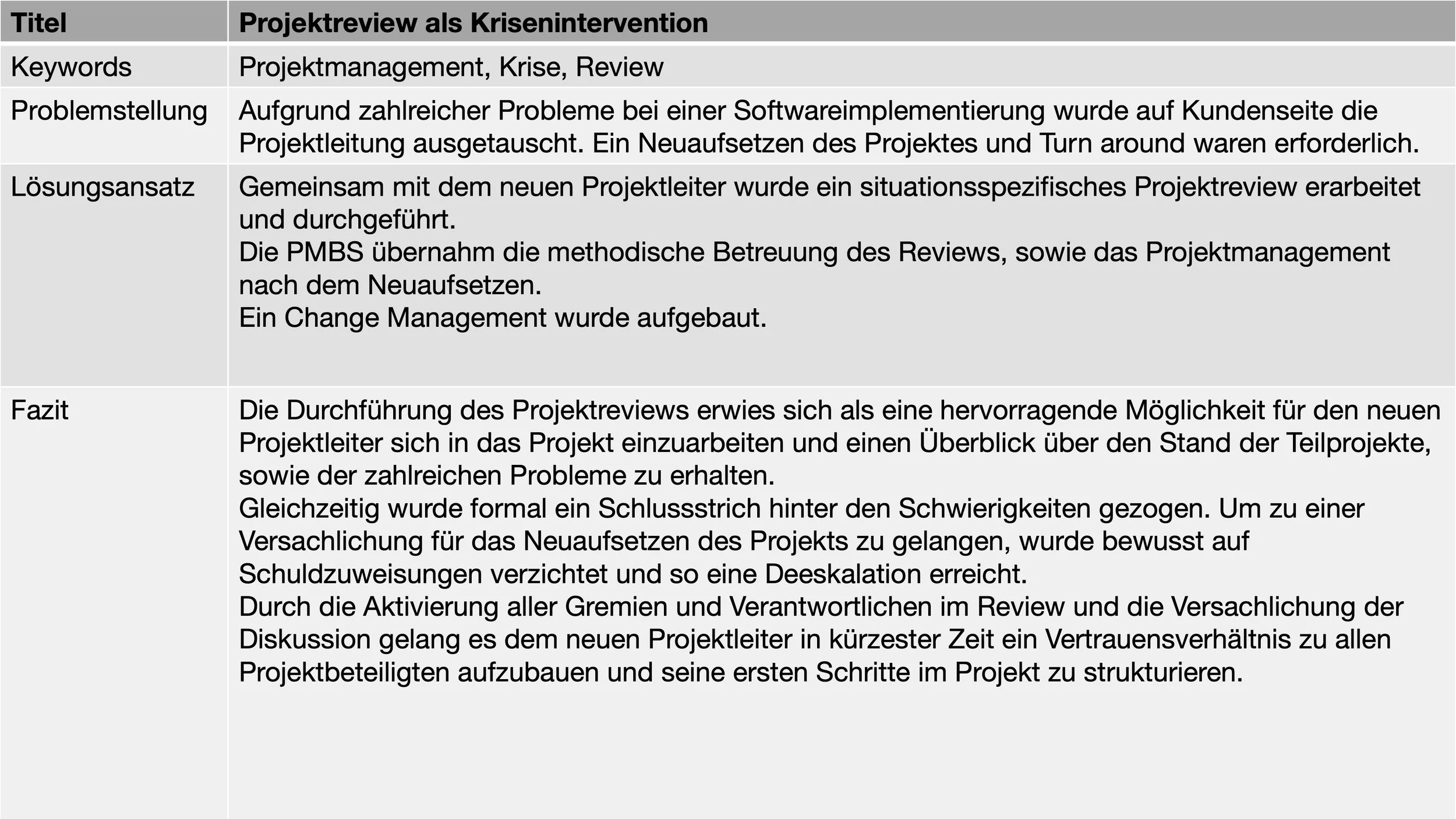 Um einen ersten Einblick in unsere Arbeitsweise zu bekommen, finden Sie im folgenden einige ausgewählte Steckbriefe von Projekten der PMBS-Unternehmensberatung: